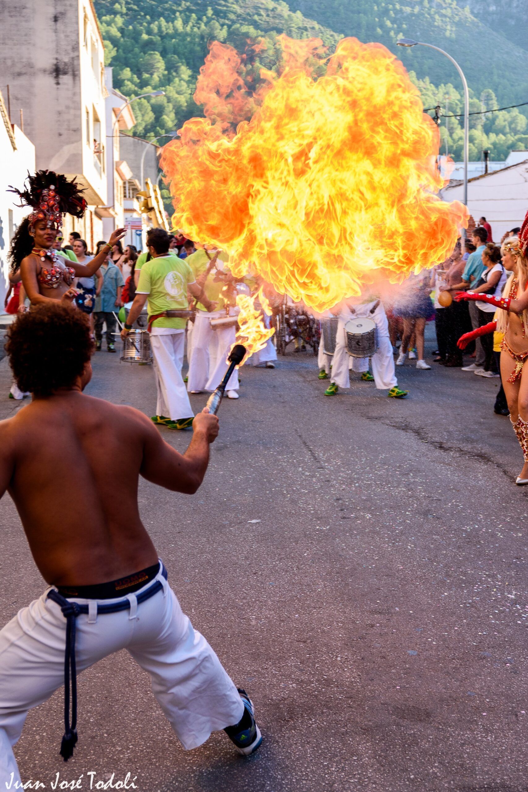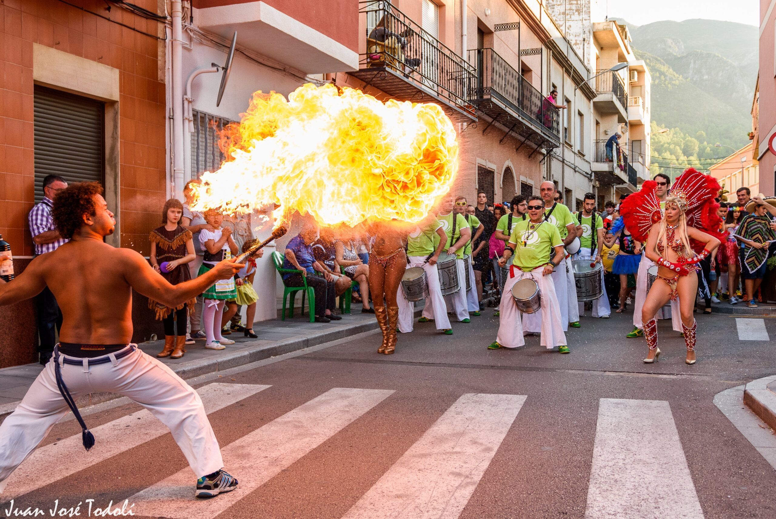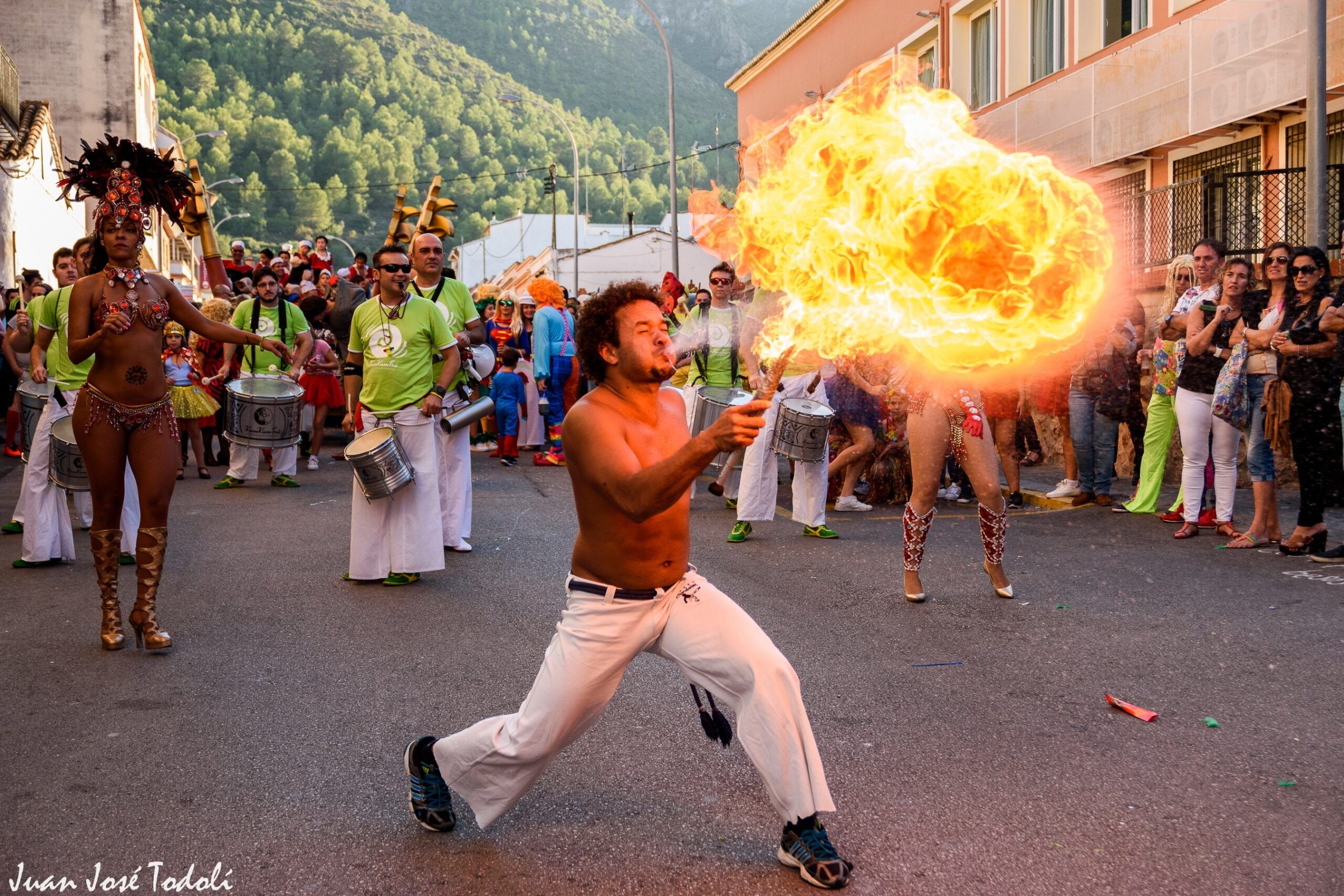 El espectáculo también incluye una fascinante actuación con fuego, en la que los artistas utilizan antorchas, aros y otros objetos en llamas para crear un ambiente mágico y cautivador. La combinación de la percusión en vivo, los zancudos y el fuego crea un espectáculo único que es tanto emocionante como cautivador.